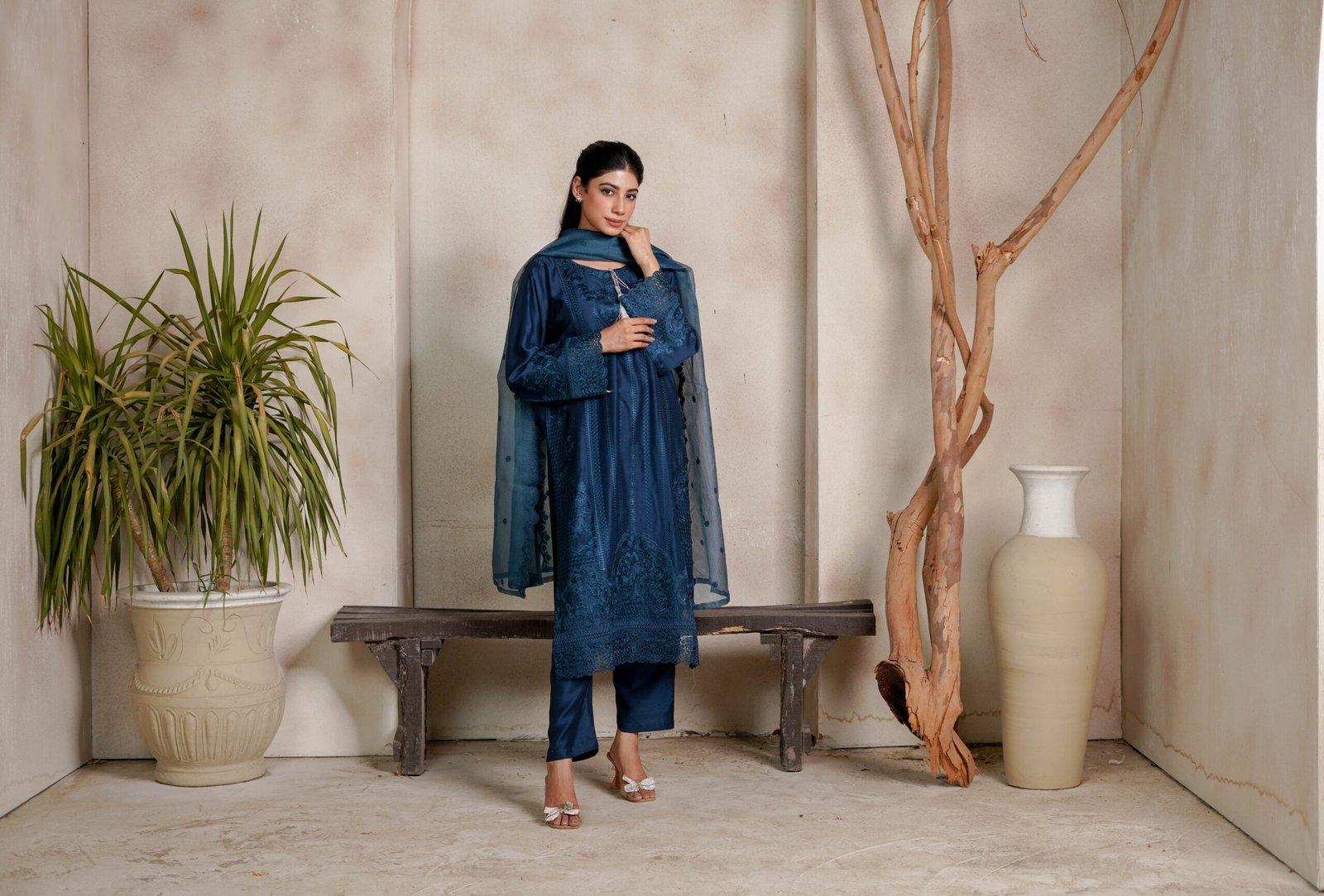 Make an elegant style statement with our Zinc Blue 3-piece embroidered suit, crafted from premium viscose fabric with exquisite organza dupatta.